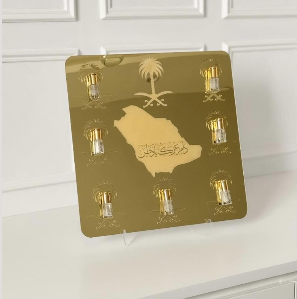 تصميم فريد يجمع بين خريطة المملكة العربية السعودية وشعار السيفين والنخلة.